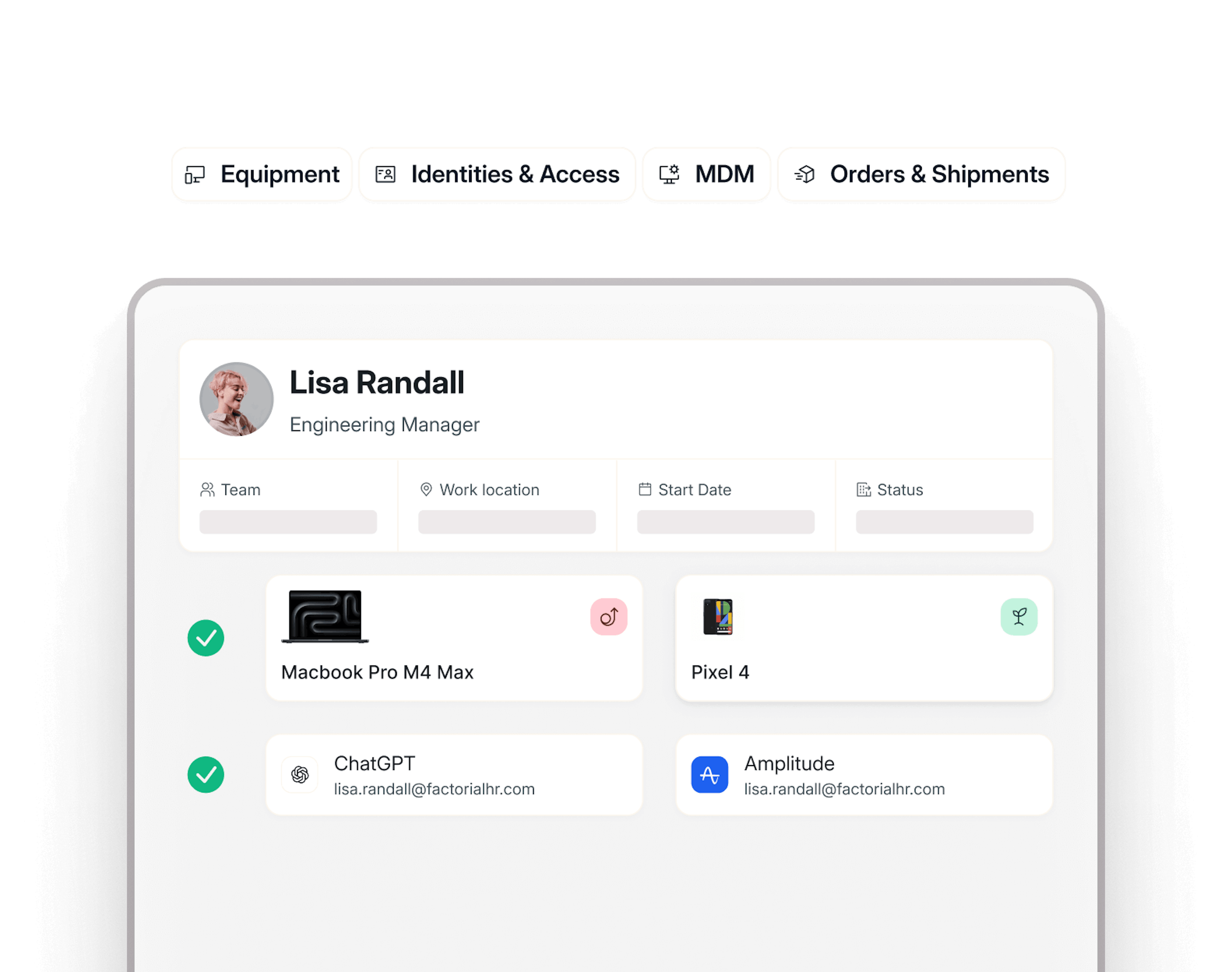 Factorial IT is connected to Factorial HR. Employee data changes automatically trigger IT workflows such as device assignment, SaaS access, and security updates.