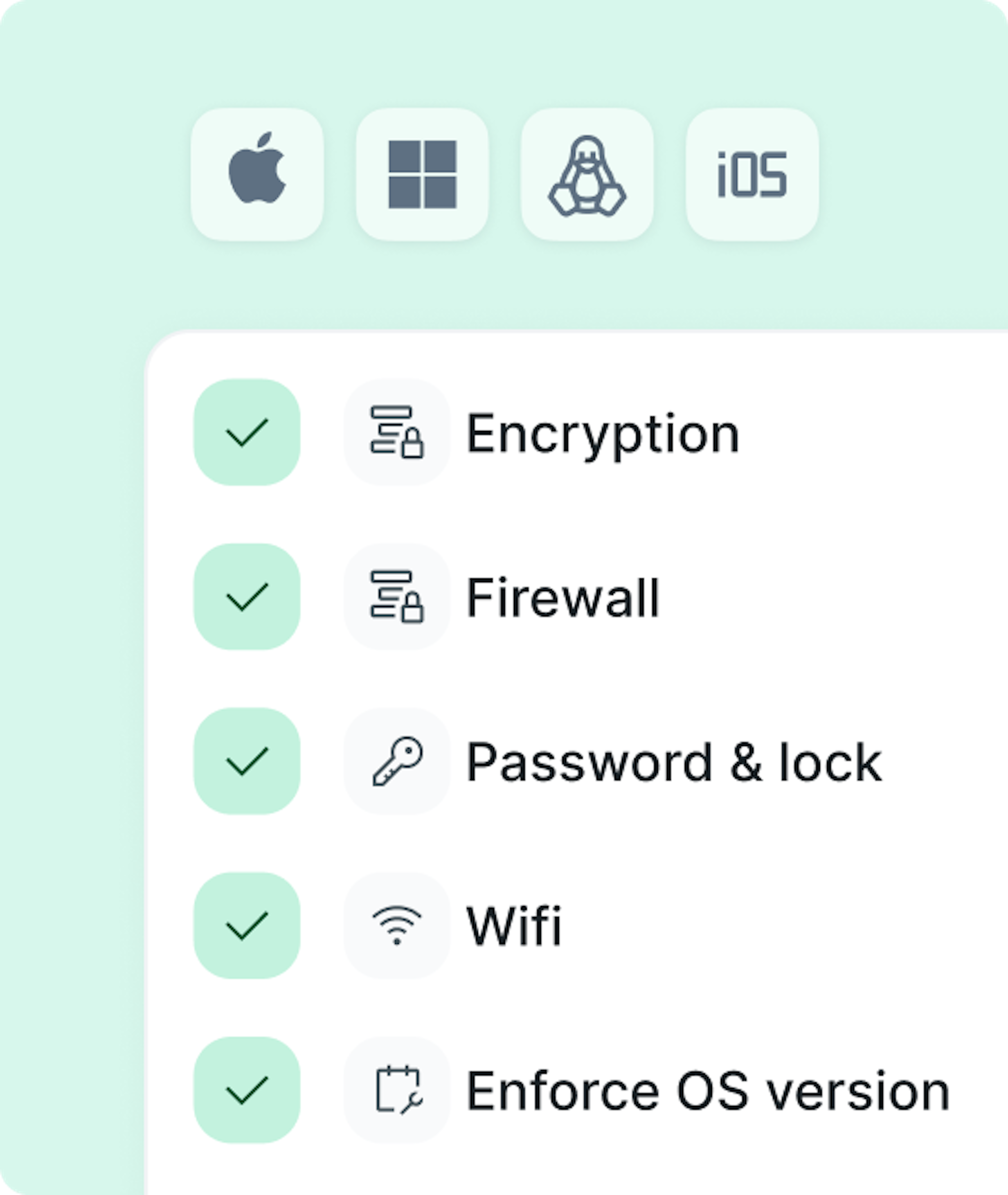 Manage Mac, Windows, Linux, and iOS in one dashboard. Enforce encryption, ensure ISO compliance, and wipe lost devices remotely.