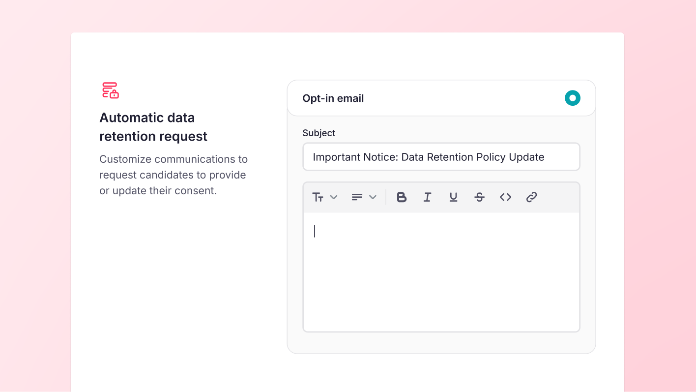 Stay ahead of data compliance while maintaining your talent pipeline. This feature automates the process of requesting consent renewal, ensuring you can continue storing candidate information legally and ethically.