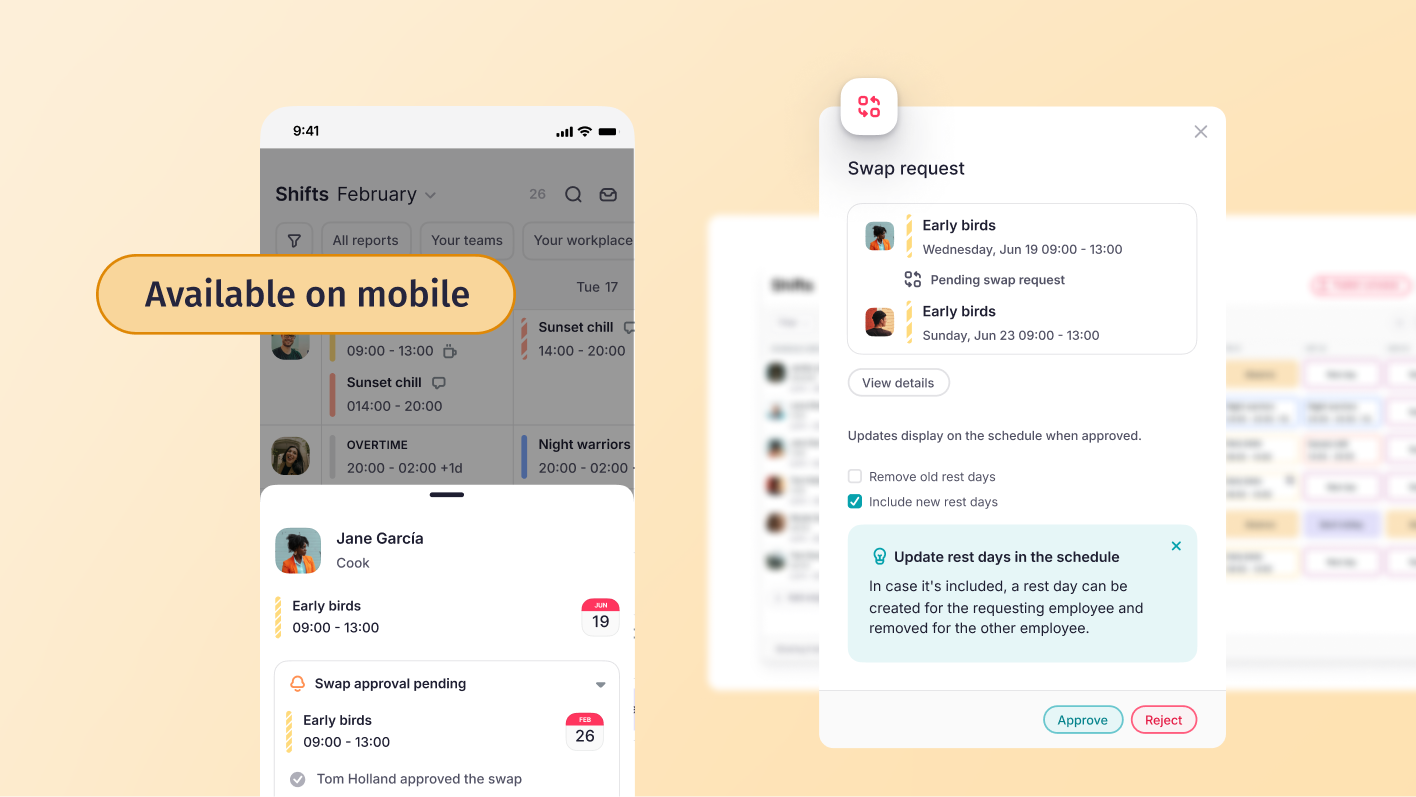 Enhance efficiency and save managers' time by requesting shift swaps from the mobile app. Streamline communication by initiating swaps through Factorial, centralizing approval flows and communication.